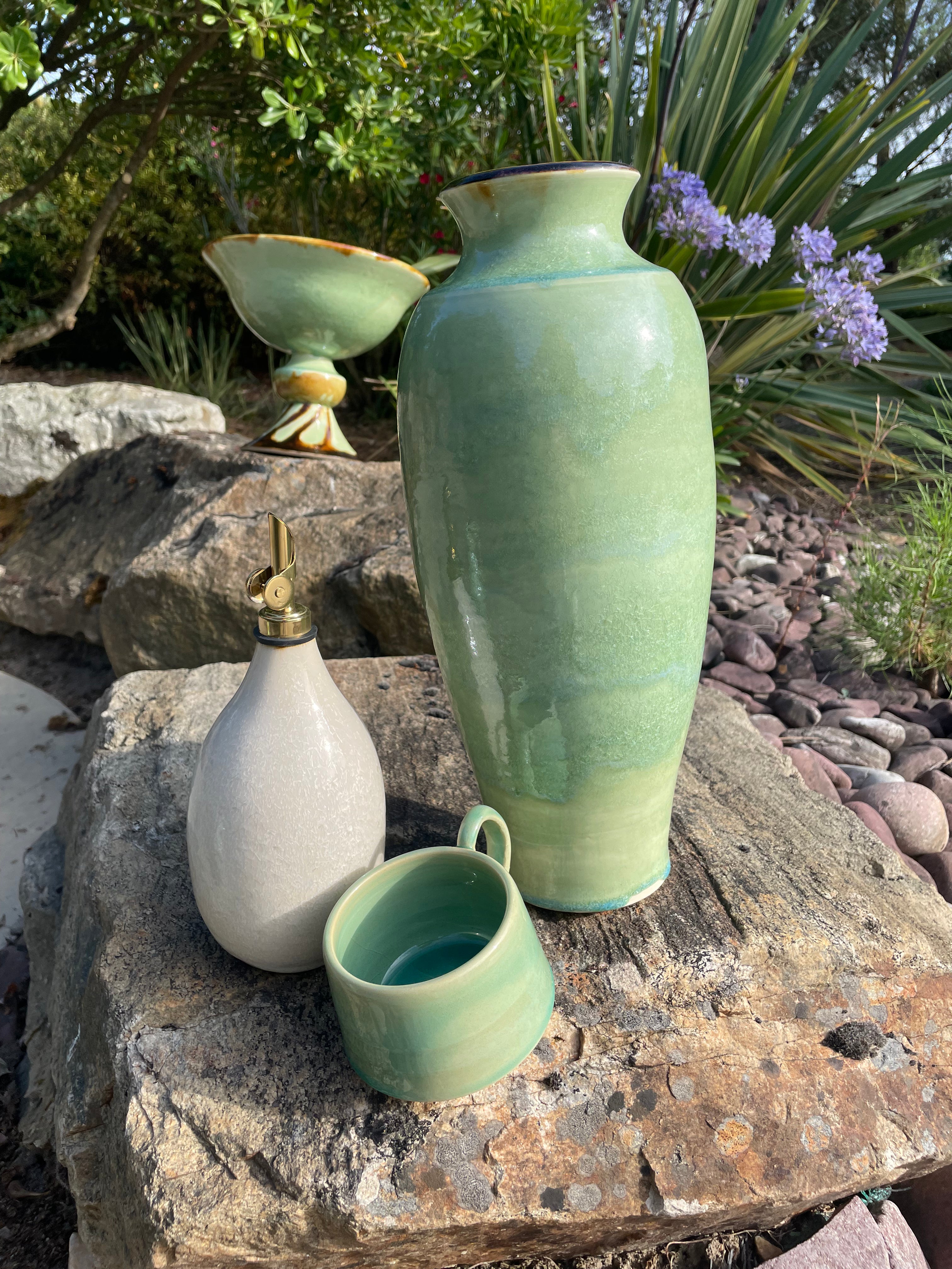 J'EFFECTUE LA PLUPART DE MES PIÈCES À L'AIDE D'UN TOUR DE POTIER, LA PREMIÈRE ÉTAPE CONSISTE À CRÉER UNE ÉBAUCHE D'UN VOLUME, ALLANT DE L'ASSIETTE AU VASE, DE L'ART DE LA TABLE À D'INNOMBRABLES PERSPECTIVES. LES HORIZONS S'ÉLARGISSENT AVEC LA PRATIQUE ET L'EXPÉRIENCE. ICI LES PIÈCES SONT EN GRÈS